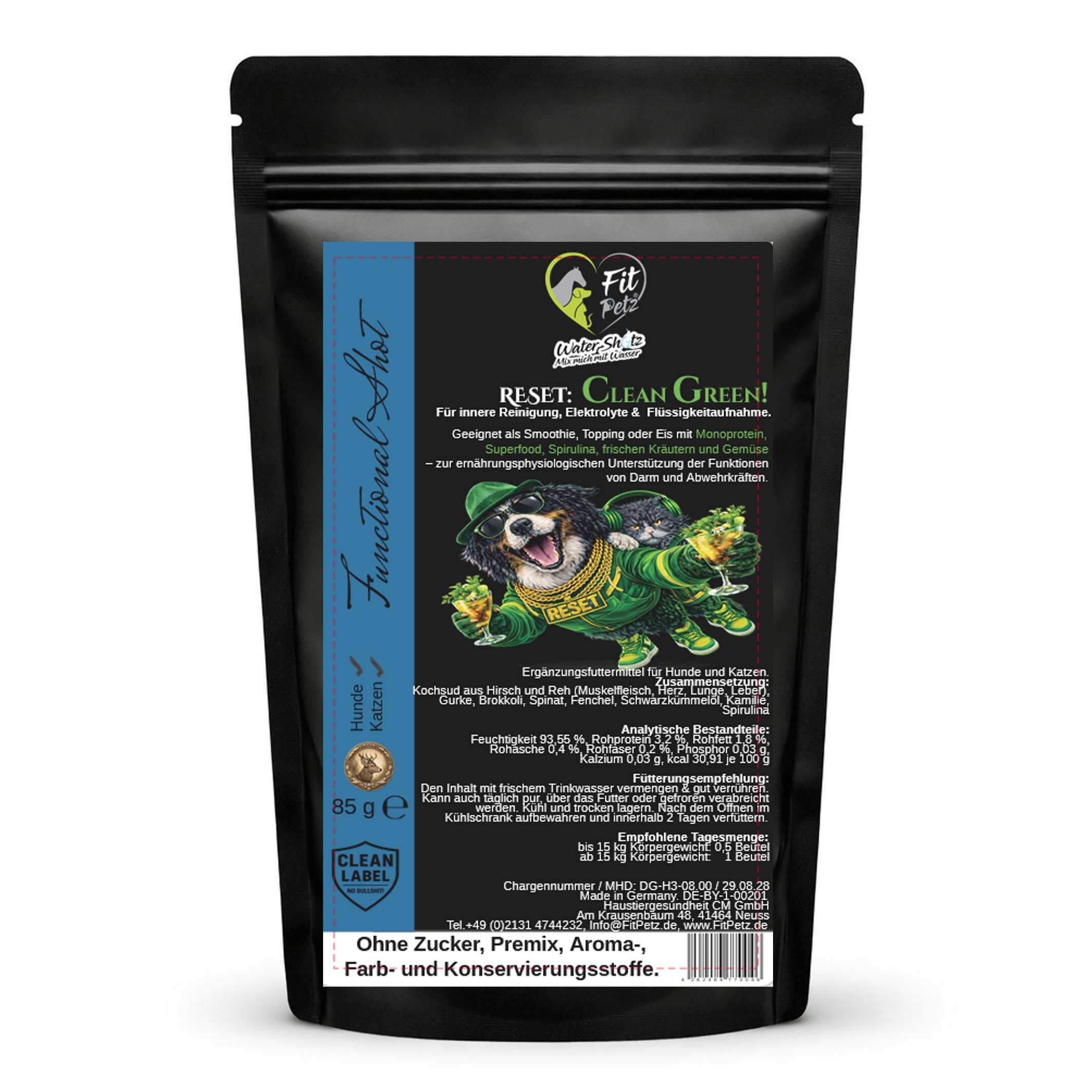 Reset: Clean Green ist der Green-Boost zur Unterstützung von Verdauung und Stoffwechsel – für Hunde und Katzen ab dem 8. Monat und ideal zur Unterstützung von Flüssigkeitsaufnahme, Elektrolythaushalt und täglicher Vitalität.